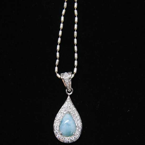The elegant drop-shaped pendant features the precious larimar stone that reveals a graceful curve. Embellished with cubic zirconia stones, the charming pendant reflects a glow of sparkling beauty. The simple but sophisticated design makes this well-executed pendant an easy match with daily ensembles.