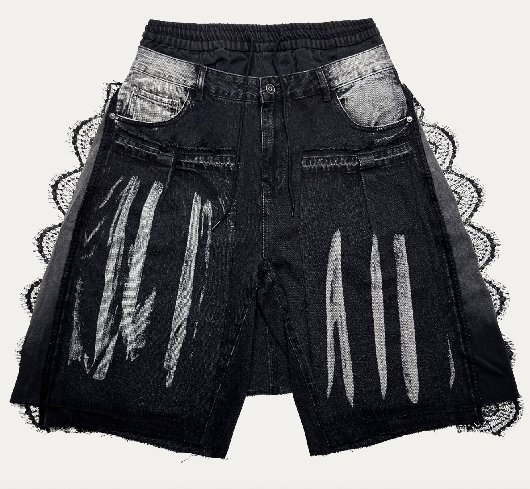 The Layered Lace Jorts in black by PCES combine a distressed denim look with bold white paint strokes for a rebellious, artistic vibe. The design features an elastic waistband for comfort and layered construction with eye-catching lace trim peeking from the sides, adding a touch of DIY style. Perfect for adding a statement piece to any outfit.