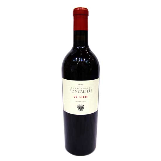 Displayed is a bottle of red wine that originates from Minervois, France. Made from a blend of Syrah, Grenache and Mourvedre, this red wine has an elegant nose, a well-balanced structure and a smooth mouth feel with a lingering finish. This high quality red wine is great for red meats and stews.