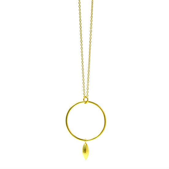 • A gold-tone circle pendant with a matching leaf-shaped charm.