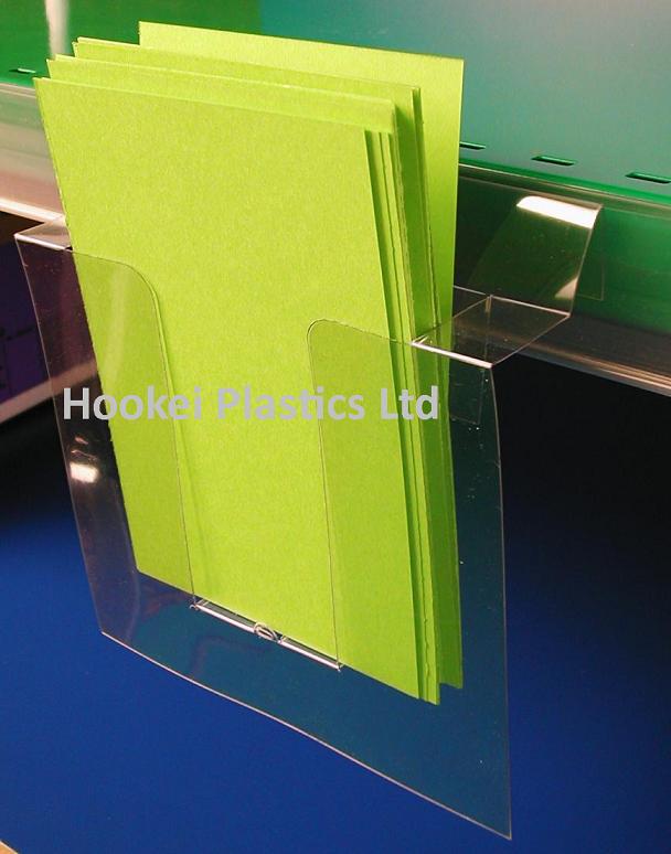 Featured is a classic clear leaflet holder placing leaflets. Two molded hooks are designed at the back for mounting shelf edges or walls. To promote your new products with leaflets or brochures, this holder can surely help.