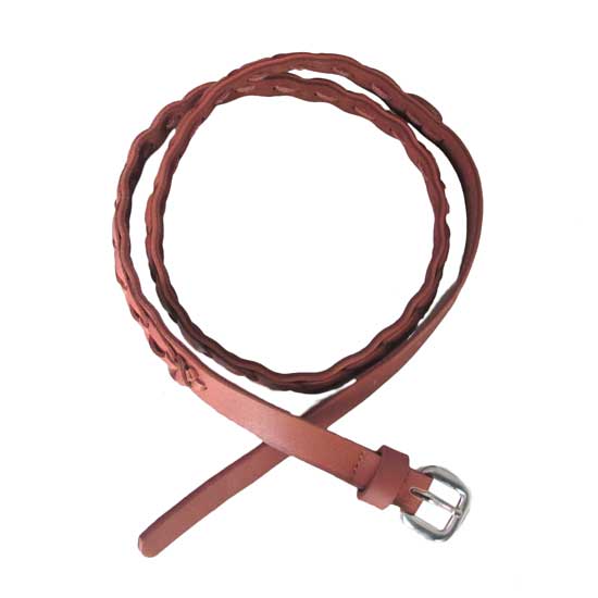 Displayed is a leather belt that comes in a slim design. Decorated with woven leather straps, this belt is soft and flexible. This high quality leather belt goes well with many styles of outfit and is durable.