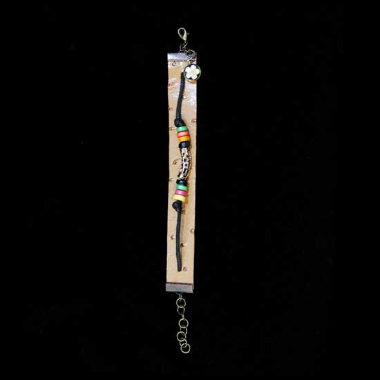 Displayed is a leather bracelet that comes with a colorful design. The decorative part is composed of different colored beads for a fun style. This leather bracelet is comfortable for wearing all day long.