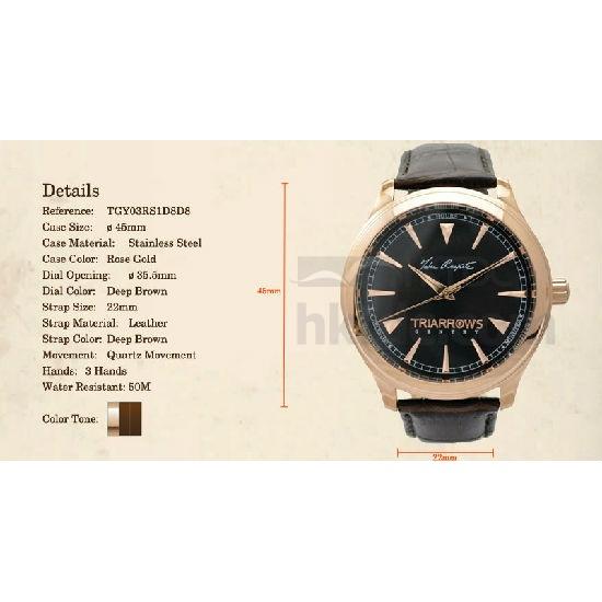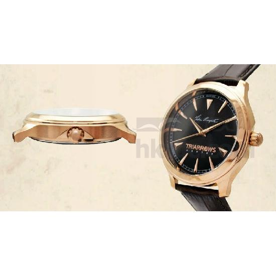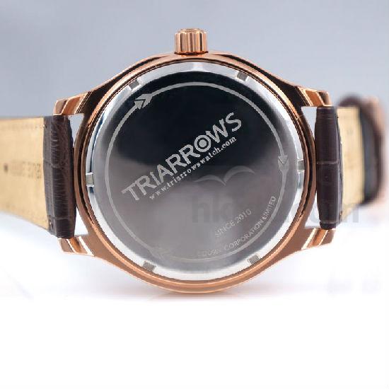 The case back has a revolving three hand pattern which is companies own distinguishing symbol, signifying that Triarrows supports and accompanies you as you pursue your own dreams and lifestyle.