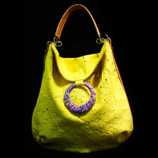 This sharp mustard yellow handbag is made with leather treated with laser cut. The colorful circular ring on the flap, made of hand-painted silk, adds a fun touch to the bag. This handbag makes a fashionable accessory for the young women.