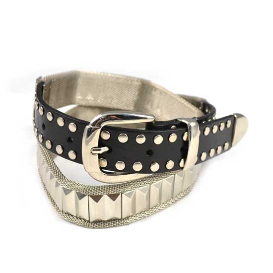 This belt features dark leather parts trimmed with silvery studs. The mesh part features shining faceted embellishments for enhanced style. This chic-looking belt will sure make you stand out from the rest.