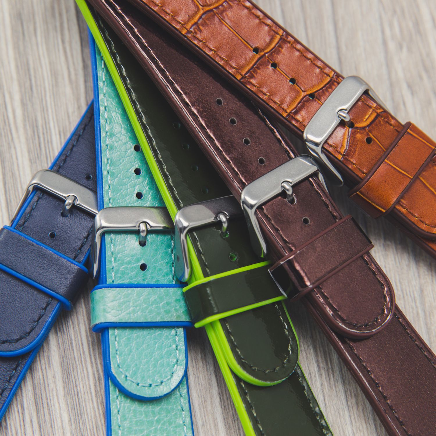 Customised Leather Style watch band building with PU + Leather or Silicon + Leather materials.