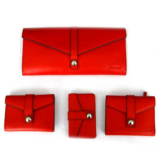 This leather wallet series in red is stylishly designed with a slim and foldable construction. The cover has a snap fastener that adds sophistication. This leather wallet is a young and trendy item to match with leather handbags.