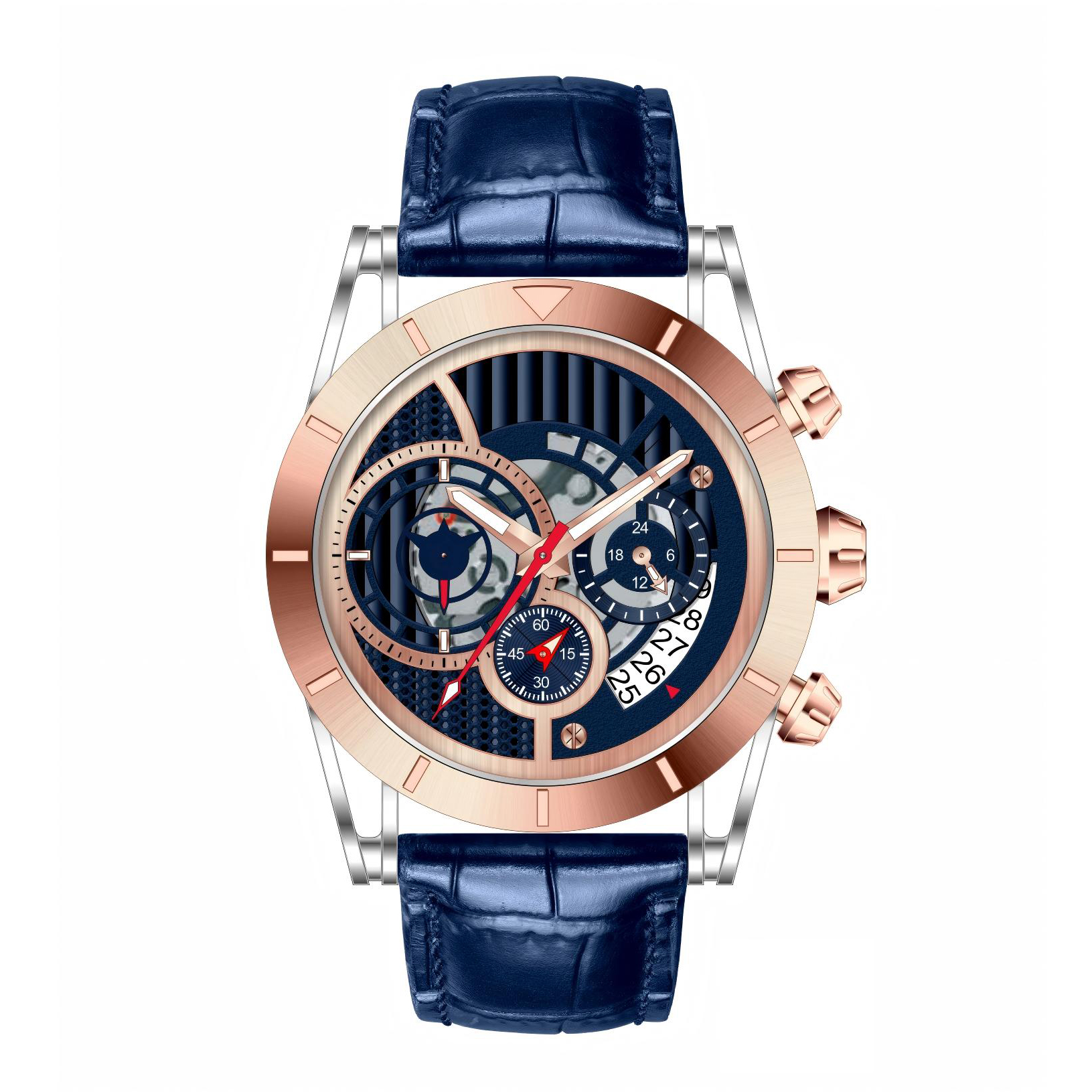 This Leather Watch showcases an unmistakably elegant design featuring bold structural lines. Its round case frames a tactile, ribbed dial that is accented with three skeleton sub-dials, and a clear date wheel for added utility. Completing the look is a refined, genuine leather strap embossed in an alligator pattern to blend classic style with luxurious textures.