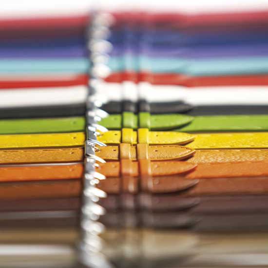 This series of leather watchbands comes in all sorts of colors. The silvery metallic buckle matches the colorful straps perfectly. These durable and attractive watchbands are a pleasant addition to your timepieces.
