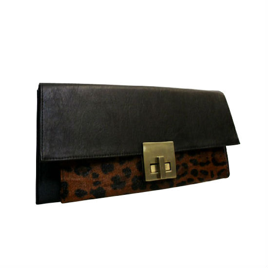 • Stylish long clutch bag with big turn lock and with leopard trim.