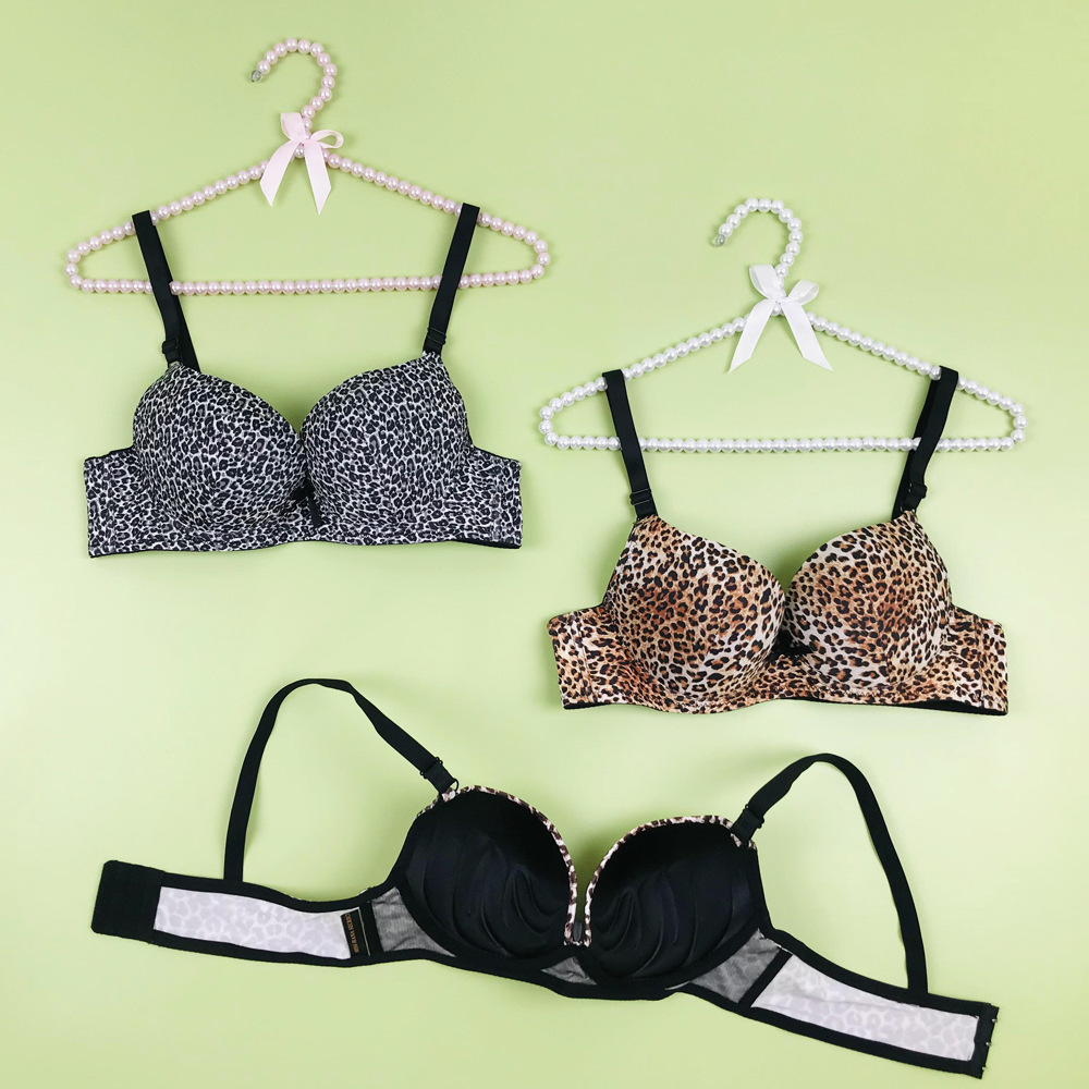 This collection features leopard print push-up bras that blend bold fashion with everyday comfort. Available in three distinct leopard print variations, these bras offer a push-up design to enhance your silhouette while ensuring a secure and comfortable fit. The animal print trend adds a touch of glamour and personality to your lingerie collection, making it suitable for those who want to embrace a bold style. Accompanied by stylish pearl hangers and delicate tulip accents in the display, these bras are not only functional but also a fashion statement. Whether for daily wear or to add a trendy element to your wardrobe, this leopard print bra set is a versatile choice that combines style and support.