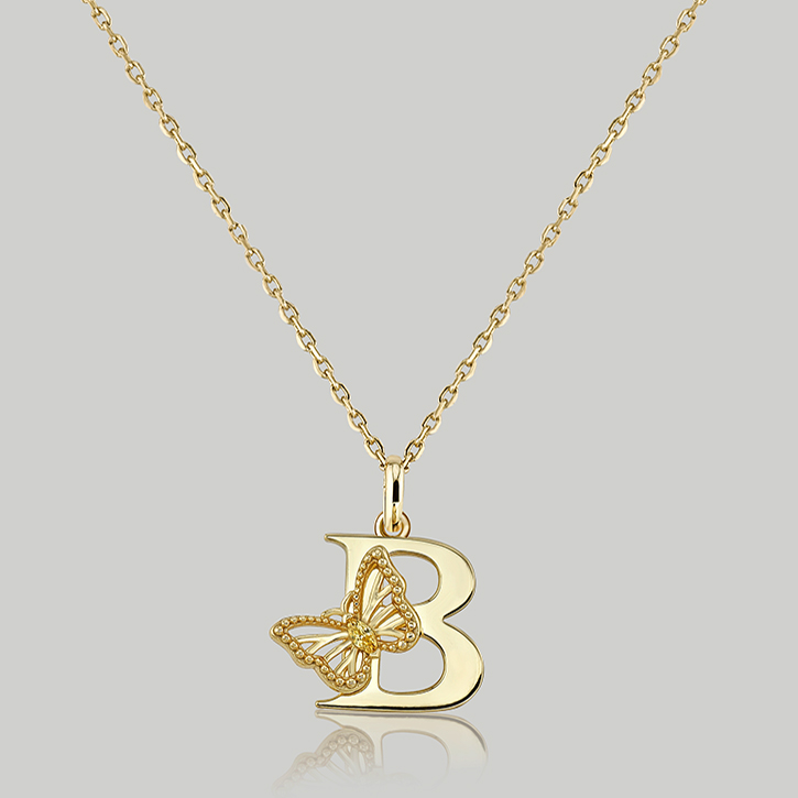 The letter "B" center sits a delicately detailed butterfly design, with a small, sparkling yellow crystal. It's perfect for those who want to showcase their name initial or love for butterflies in a stylish way.