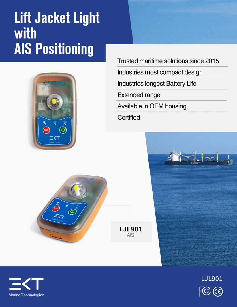 The LJL901 is a compact AIS Man-Overboard beacon integrated with a high-visibility life jacket light. Designed for maritime professionals and water sports enthusiasts, it transmits real-time GPS position to nearby vessels upon activation, ensuring rapid location and rescue.