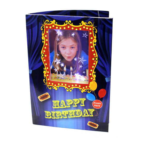 The light panel card features a mysterious yet tempting stage curtain background. It is crafted with a pseudo photo frame in front with a lovely girl blowing out candles. By pressing the round button in front, an enchanting light effect will be displayed.