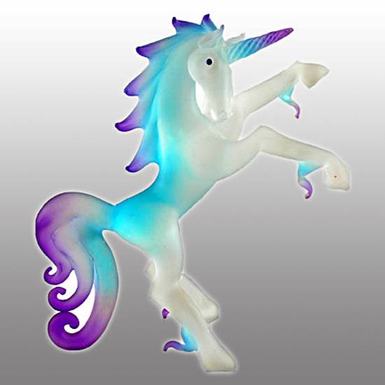 The light-up unicorn flaunts a soft glow in purple and blue. The prancing unicorn is delicately crafted for an impeccable touch. This hand-blown glass unicorn is an elegant addition to your collectibles.