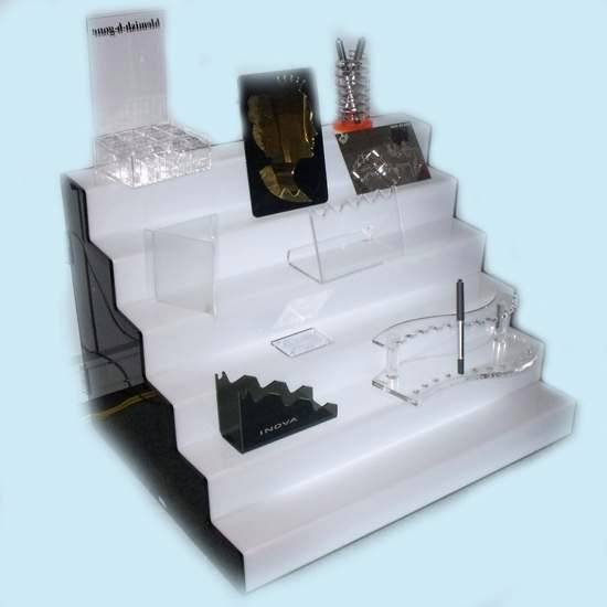 This acrylic shelf features an innovative and unique stairway shape. Its light-up function allows it to brighten and glow in the dark, and also promises attention from everyone. The five stair steps provide sufficient space for displaying various products. It is an eye-catching and useful display unit for shops and retailers.
