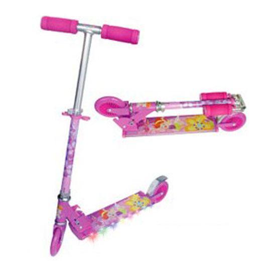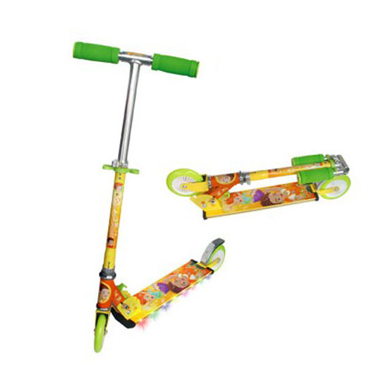 Showcased here is a 2-wheel metal scooter that comes with light effects and adorable cartoon patterns. This fancy scooter is produced with a strong structure for players' safety. This colorful, sharp toy scooter delights any child.