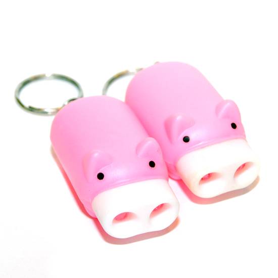 The products shown on the picture are two lighted key chains featuring a pig design. There are LED light sources coming from the two noses, which is cute and lovely in style.