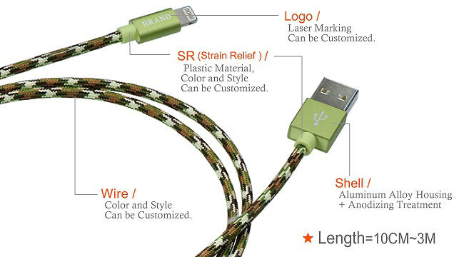 • Lightning cable, PVC+nylon braided, long SR, al. shell, colorful, 0.3~3M.