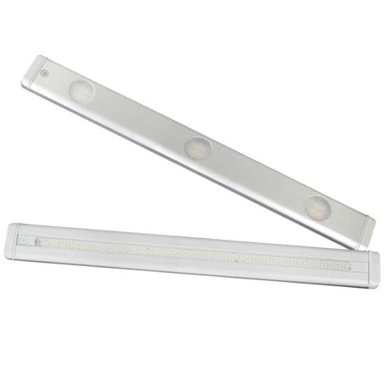 This photographed linear light highlights a very slim profile, making it technically suitable for cabinets. The light integrates high power LEDs in stylish aluminum design. The light is available with LEDs arranged in full line or 3 center-in spots.
