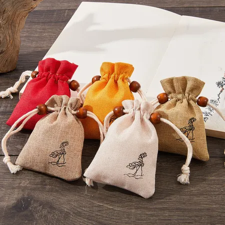 Linen bag with drawstring pocket, linen bag with bead-tied drawstring opening, jewelry box with beads, packaging and storage bag with fine linen strips, small linen bag for storing knick-knacks