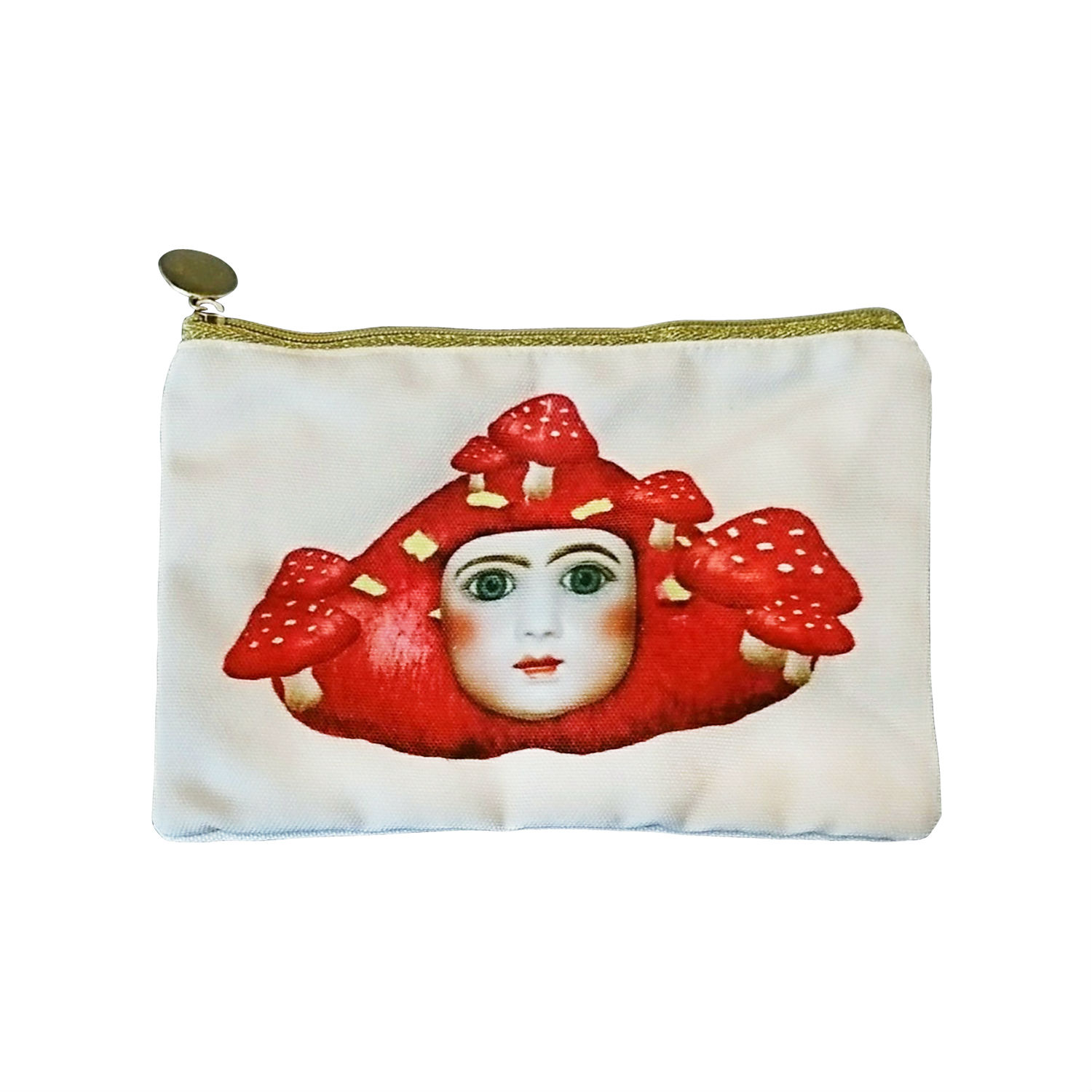 This fashionable cosmetic pouch is adorned with prints of a cute little girl and mushroom. With its large rectangular compartment, you can keep your makeup products and other accessories secure and organized. Made of polyester, this cosmetic pouch offers good protection to your essentials and would be a must-have item for your bag.
