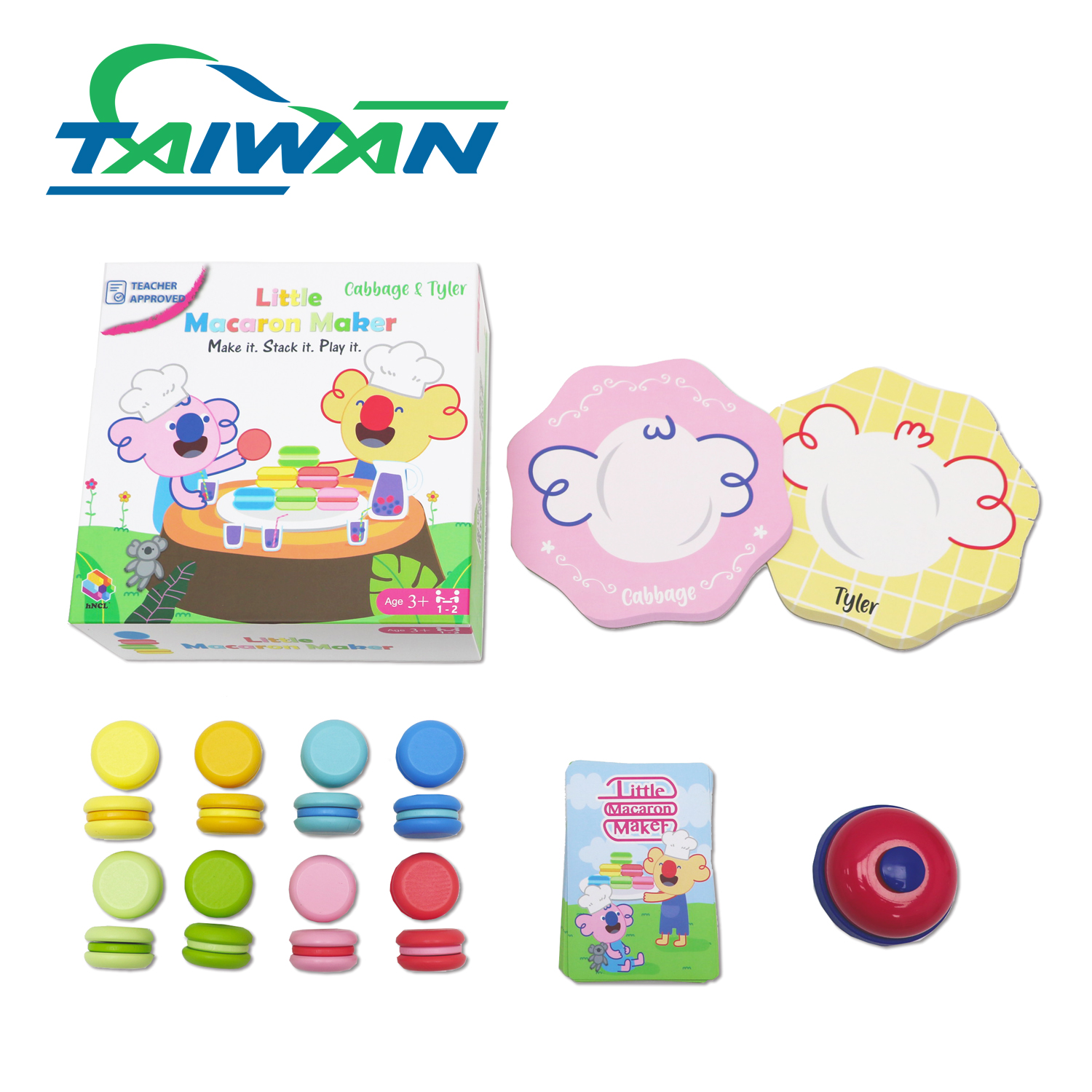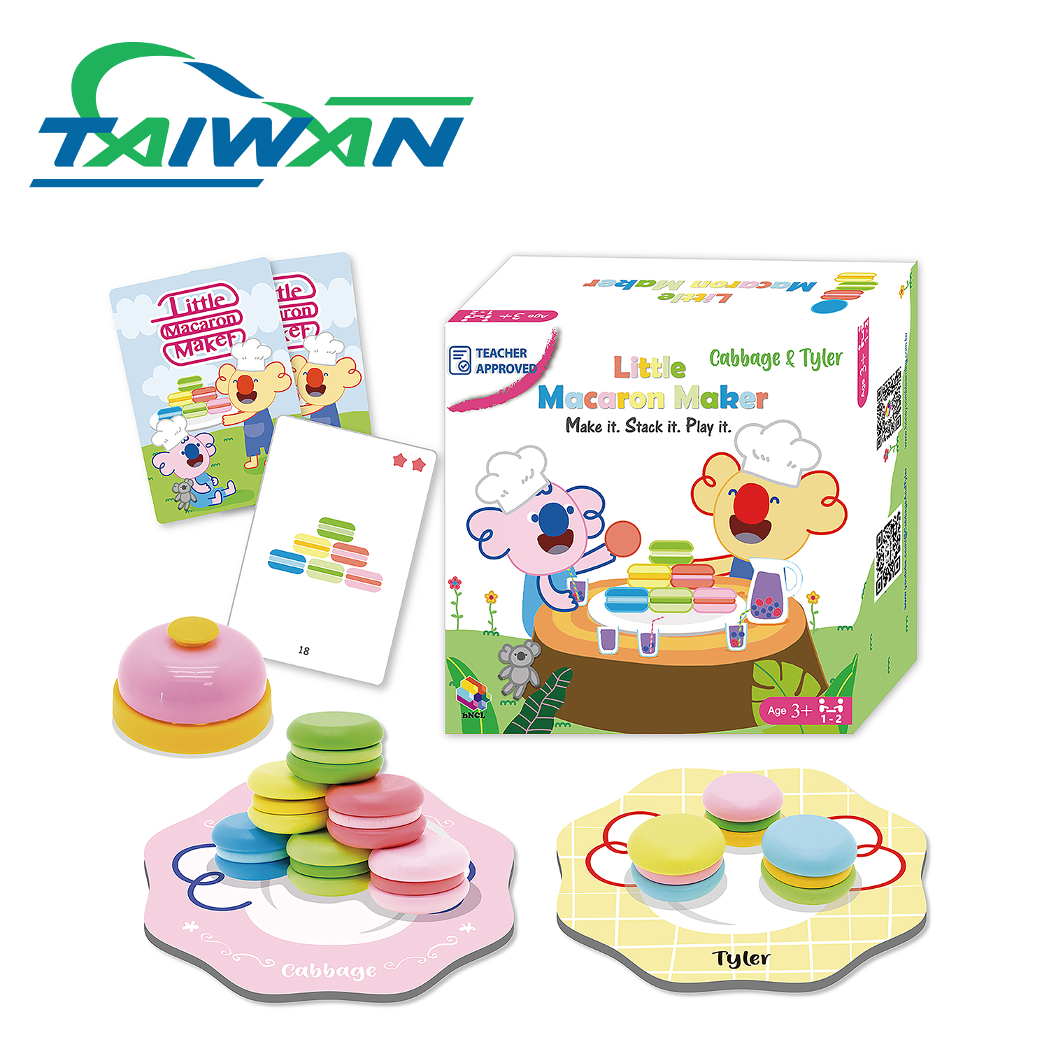 Little Macaron Maker contains 2 delightful sets of brightly colored macaroons, 40 stacking cards and a bell.