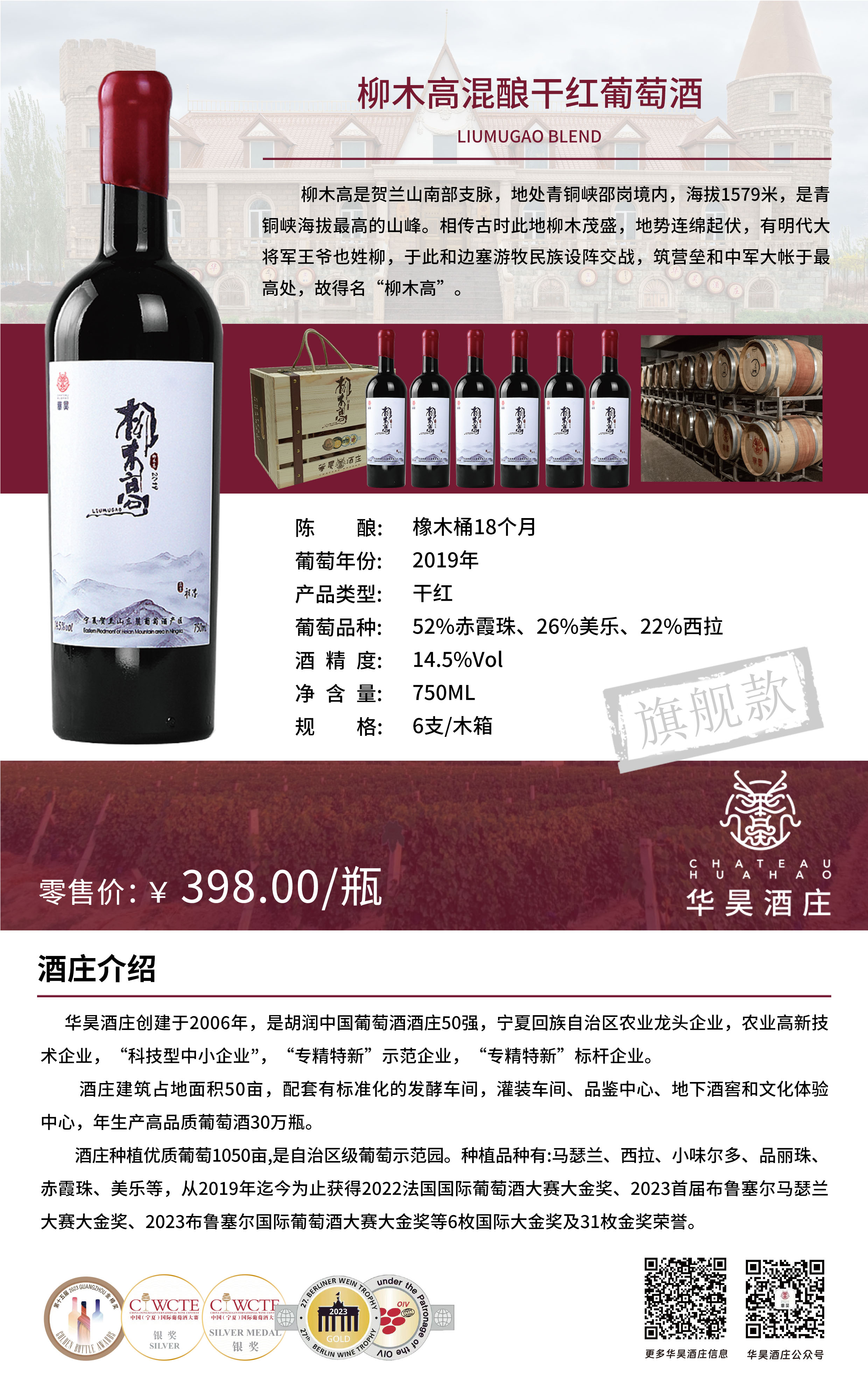 Liumugao,Helan Mountain Branch,is located in the area of Qingtongxia,with an elevation of 1579 meters. It is said that there was a lord ,named Liu,led the army in battle.He watched the battlefield and commanded the battlefield on this mountain then got his name by visiting the mountains.As the featured product of Huahao,Liumugao is brewed with Cabernet Sauvignon and Merlot.With deep ruby red color,ripe berry aroma,and baking aroma from oak barrel,the wine is round and full , long aftertaste.