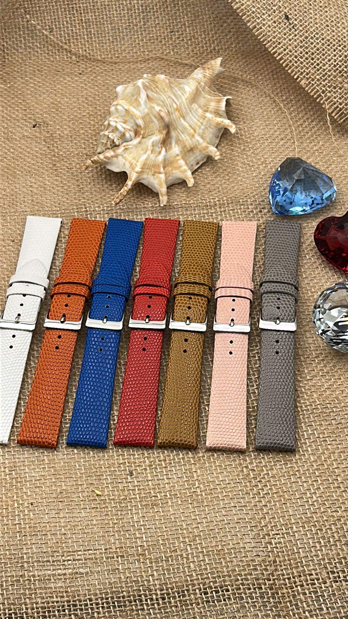 Remborded edge, thickness 2.8MM, convex top surface, lizard grain calf top with beige colour genuine nubuk lining.