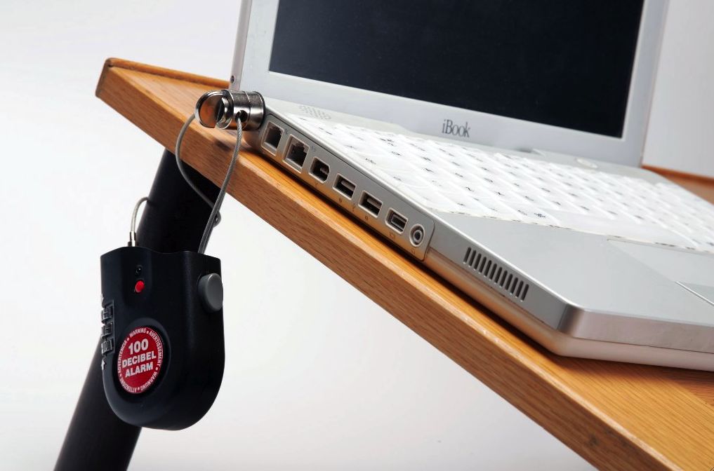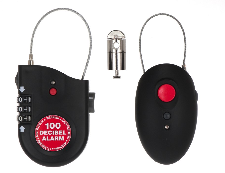 - A retractable cable lock with alarm suitable for securing your valuable items from theft. When an attempt is made to cut through the steel cable a 100 decibel siren starts screaming.