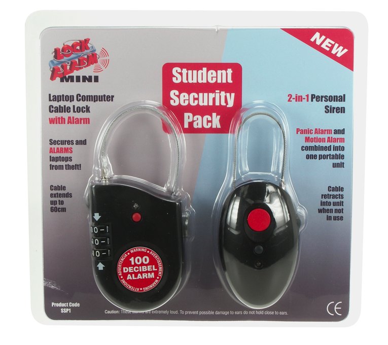 A special edition combo pack containing a Lock Alarm Mini for laptop computer security and a 2-in-1 personal siren.