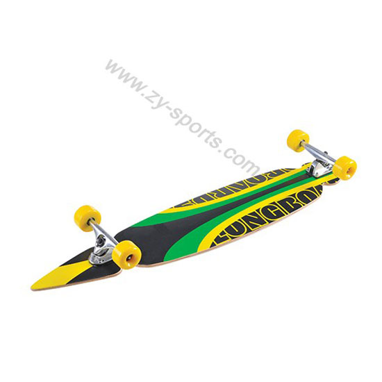 This is a chic long skateboard with a colorful design in a unique shape. It is made of quality materials for a long service life. This high-quality skateboard is a cool sports item for kids and young people.