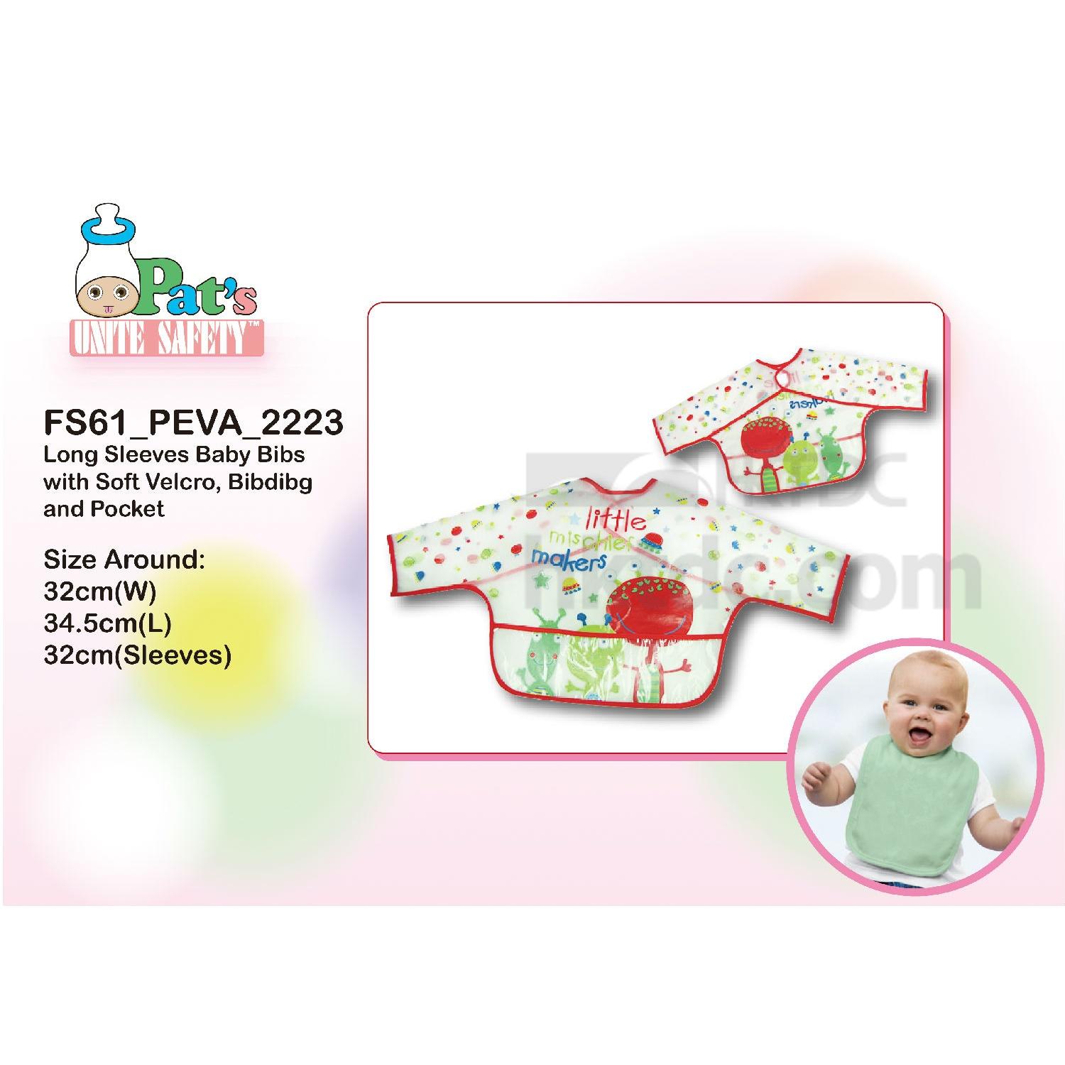Keep messes to a minimum with this long-sleeve baby bib on your young one at feeding time. Made of 100% PEVA of T/C binding, the trimmed bodice showcases colorful patterns and prints to captivate eyes. A pocket is further spotted in front for catching food crumbs.