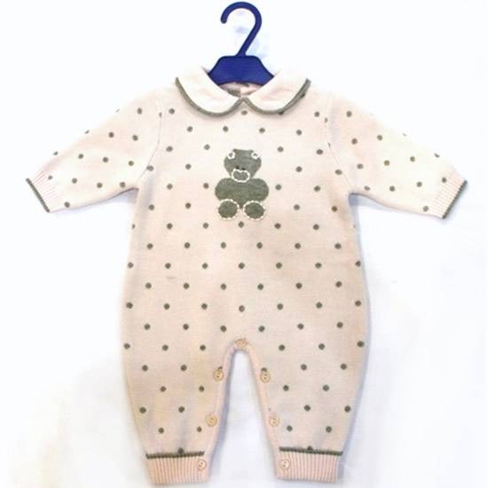 The one-piece baby romper suit features polka dots with long sleeves and a lay-down collar. The bottom comes with 6 snap buttons for easy diaper changing. This knitted baby romper suit is a great addition for your babies' wardrobe.