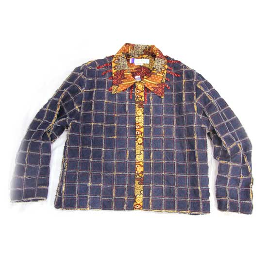 Shown here is a long-sleeve shirt coming with a pointed collar. The design features all-over blue and white checks matched with colorful floral trimmings. This shirt presents a perfect blend of style and tradition.