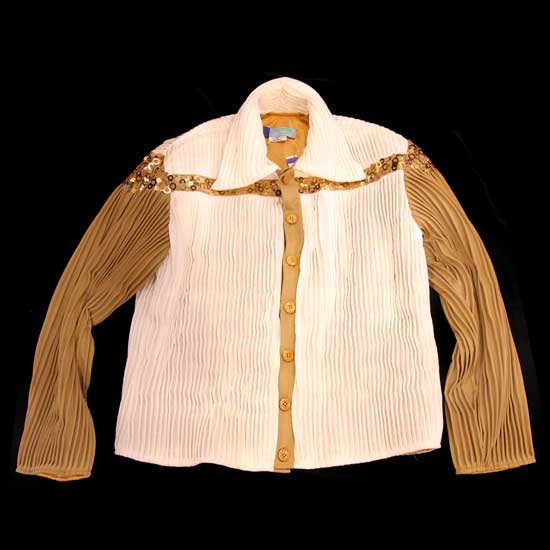 This is a long-sleeve shirt boasting a fashionable design. The collar and front panel come in white, matched with beige sleeves and trimmings. The fine pleats all over the shirt exude a decent style.
