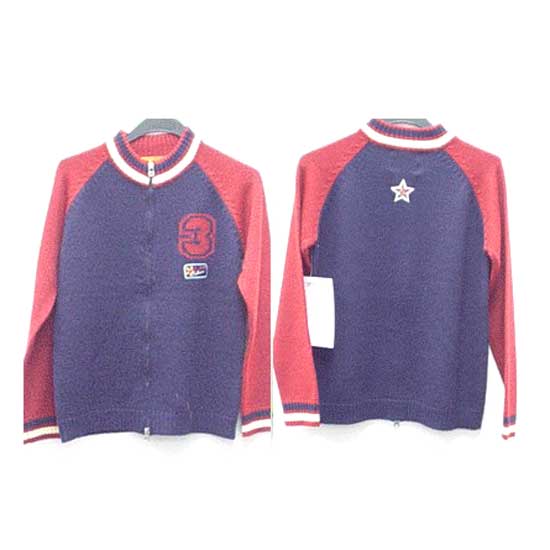 Highlighted is a long-sleeve sweater coming with a zipper front. The sweater boasts a sporty design in a sharp match of red, blue and white. Striped bands are added at the collar and cuffs for enhanced style.