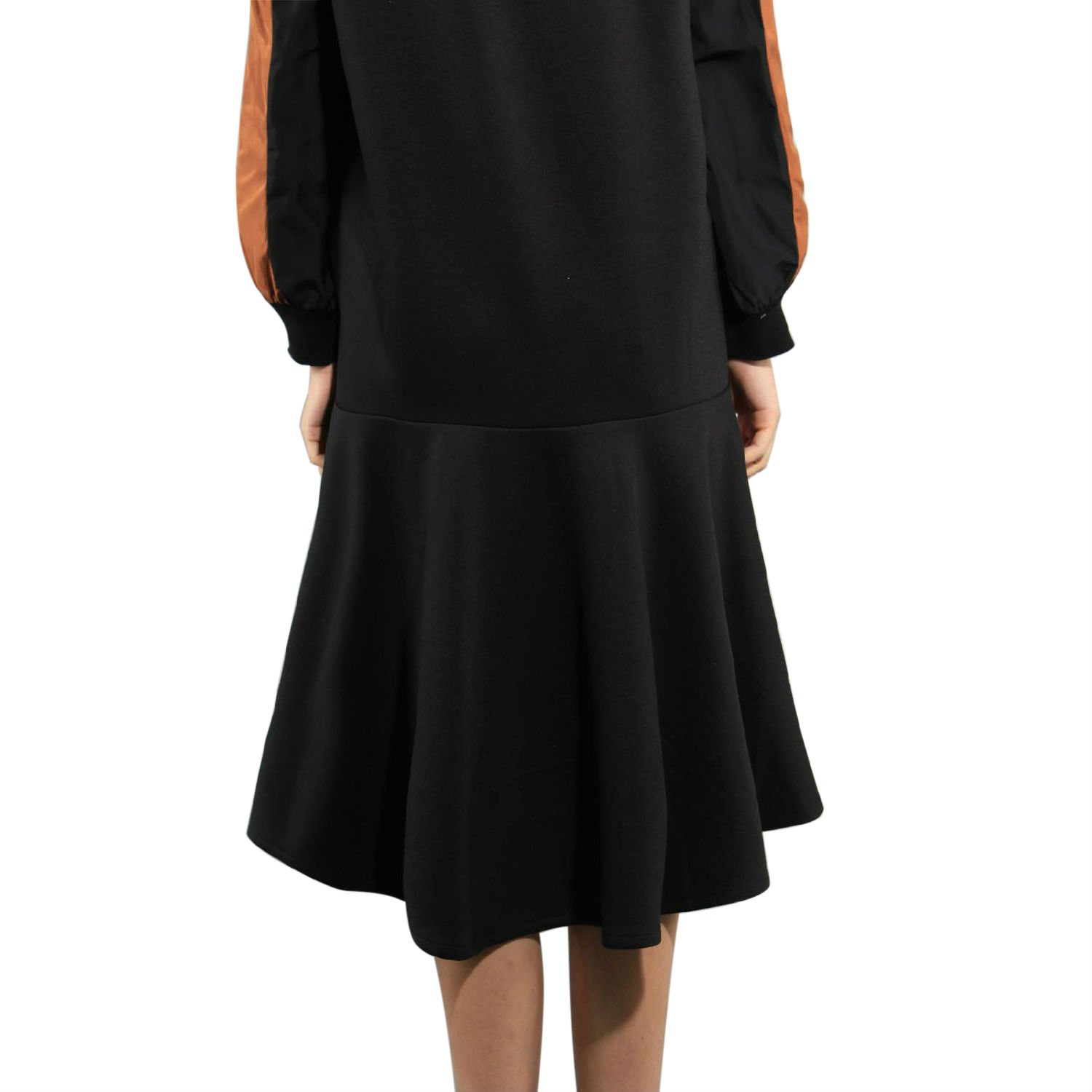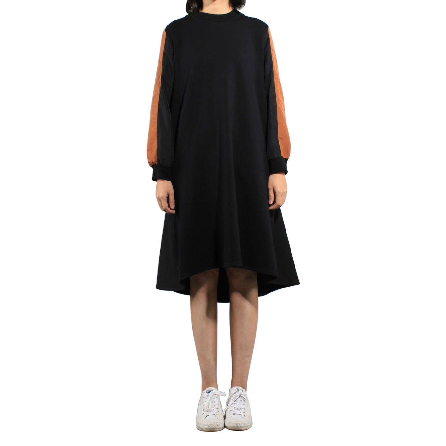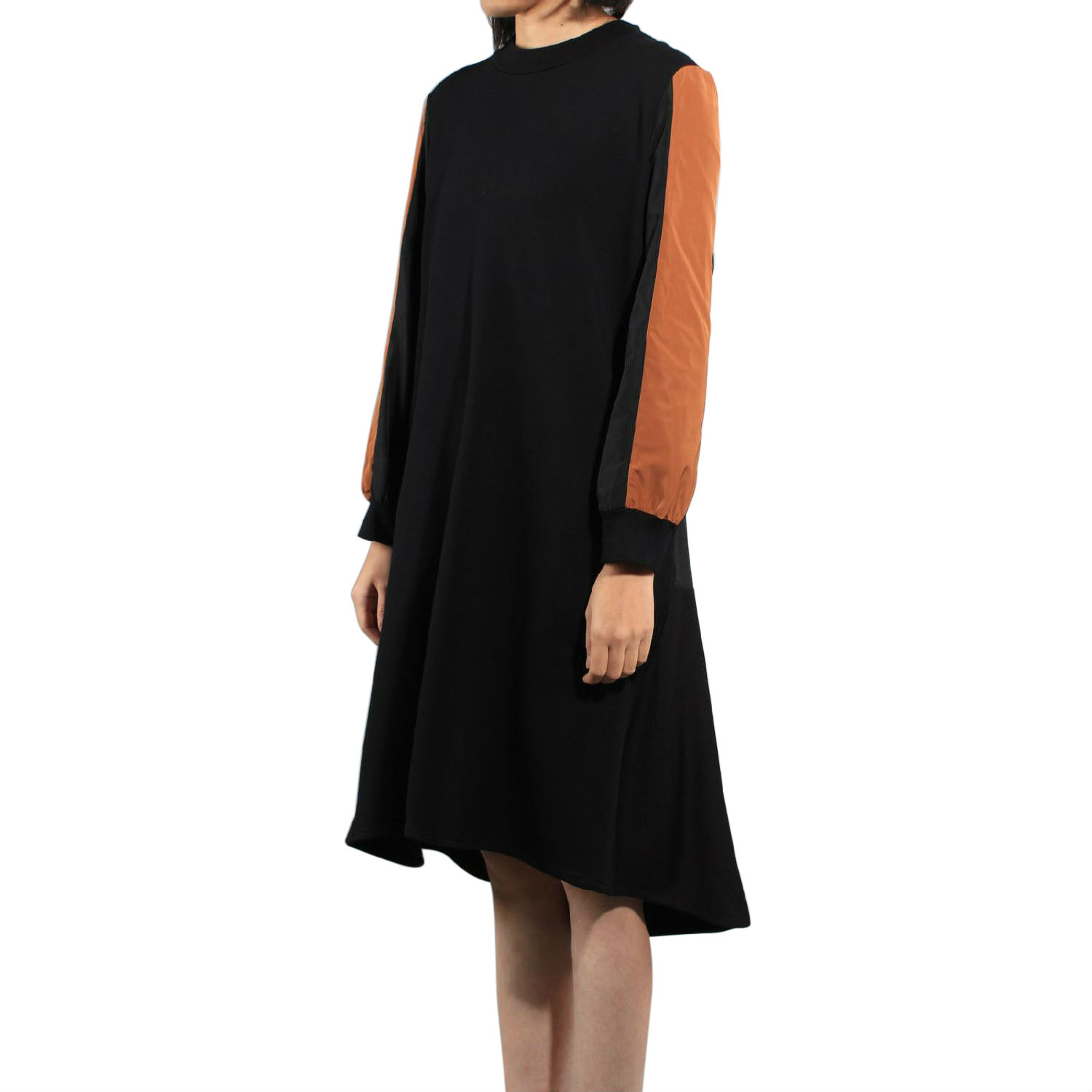 Channeling a laid-back style in a loose cut, this drapey midi dress realizes a contemporary cool style in a dark shade. The two-toned sleeves bring hints of color dazzle to give a contrasting visual effect. Completed with long sleeves, round neck and high-low hemline, this is a versatile piece for fall seasons.