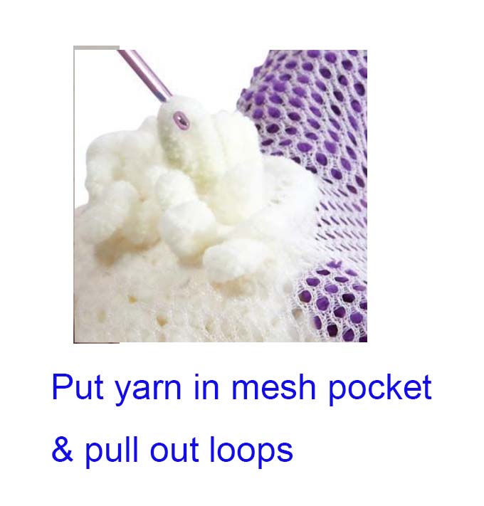 Using the enclosed crochet hook, you pull out loops through the mesh Creating your own personalized look for your new fluffy friend!