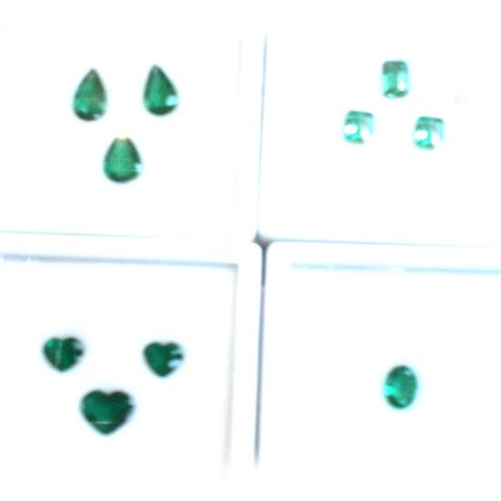 These pieces of loose emerald in pear, heart and emerald shape. They have blue-green to green color with great brightness. They can be mounted onto different jewelleries.