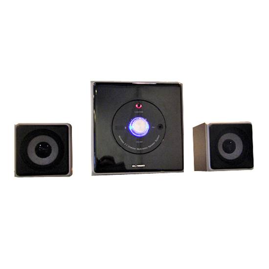 This is a set of three loud speakers with digital sound effect. With two smaller side speakers and a main unit with blue light on the knob, they have wooden casings and are compatible with multi-input function.