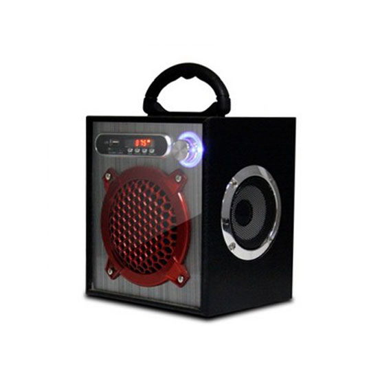 This is a black tone loud speaker coming in the shape of a cube and is decorated with red-colored details and a silvery panel. The loud speaker provides you with quality sounds with excellent clarity. This loud speaker comes with a handle on the top for improved portability.
