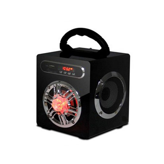 This is a smart-looking speaker coming with an allover black design, decorated with silver panels. The speaker features a handle on the top for improved portability. This speaker produces clear and vivid sounds for the best audio enjoyment and is a great addition to your home audio system.