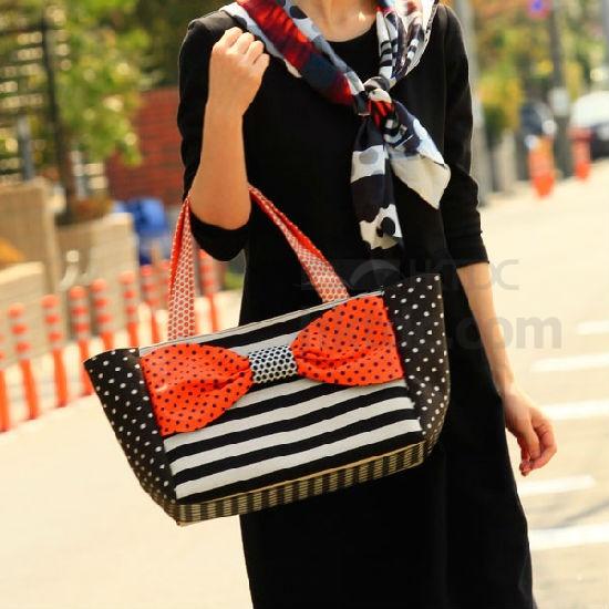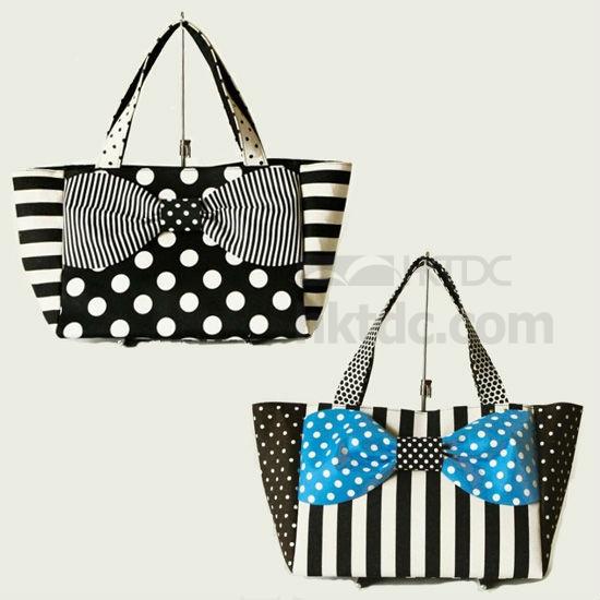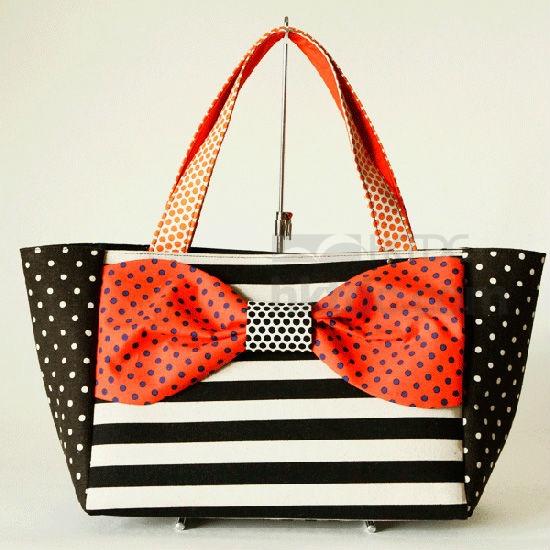 This tote bag is made of printed cotton and backed with durable material so that it is very lightweight and hardy. It is designed with a impressive big bow for an eye-catching look. This tote bag features two handles on the top for easy carrying.