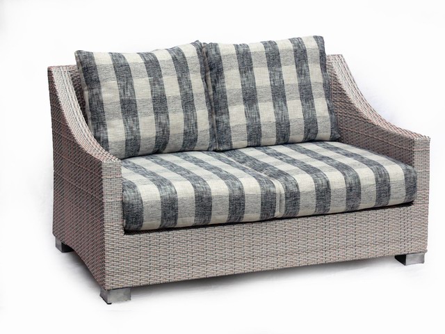 All-weather aluminum wicker love seat is durable and stylish. It features comfortable checked pattern cushions.