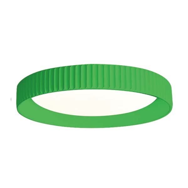 This is a circular ceiling light. The edge of the lamp body is brightly green, with a textured design of vertical stripes that add a sense of layering. The central part of the lamp is a white light - emitting area. The overall shape is stylish and lively, making it suitable for spaces like children's rooms or dynamic studios, adding a bright touch to the environment.