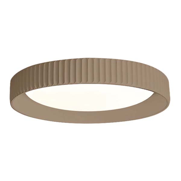 This is a circular ceiling light. The lamp body is khaki - colored, with vertical concave - convex textures on the edge, giving it a three - dimensional and stylish look. The central light - emitting area can emit bright and even light. The overall style is simple yet elegant, suitable for installation in home spaces such as living rooms and bedrooms. It can not only provide good lighting but also add a warm and soft atmosphere to the environment, fitting home decoration styles like modern minimalist and Nordic styles.