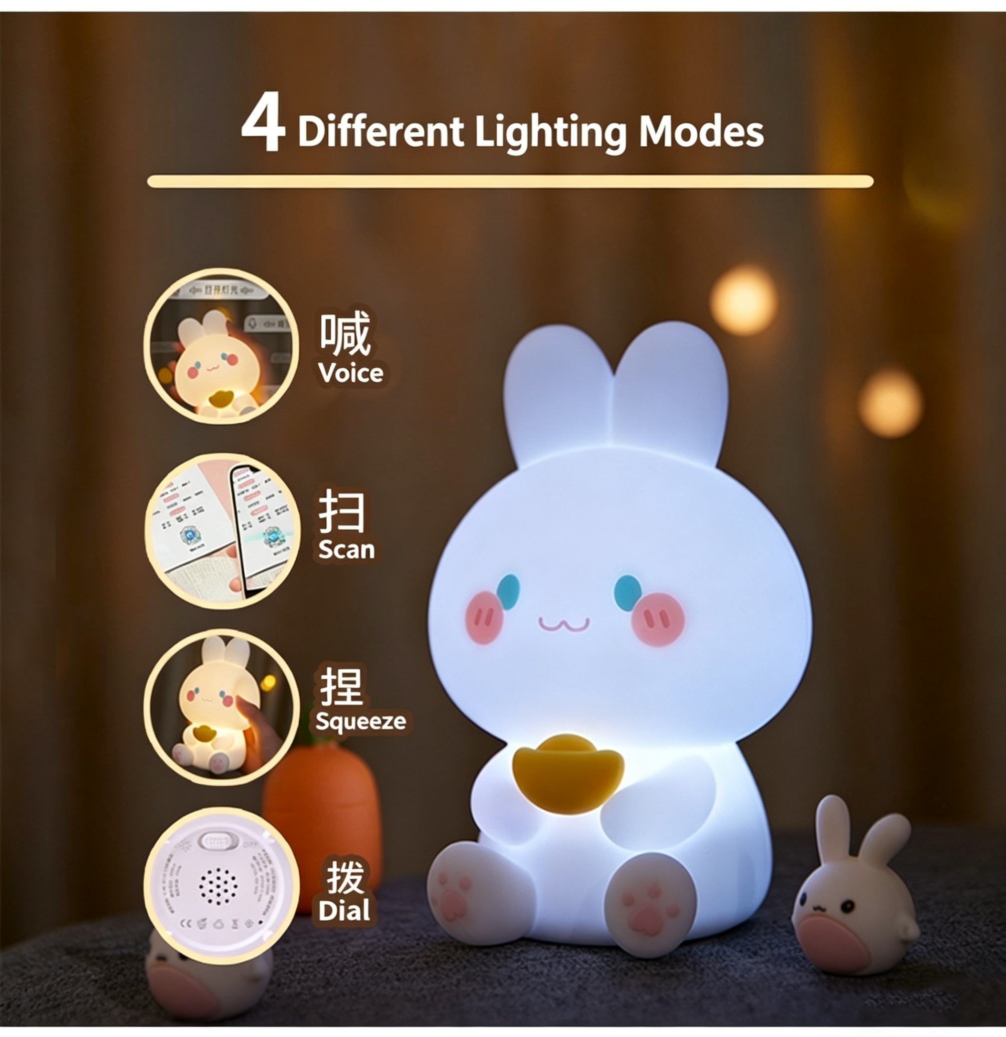 2. 4 Control Methods: Voice / Bluetooth Mini Program / Squeeze Silicone / Physical Button, 4 ways to turn on the light, fits all usage habits.