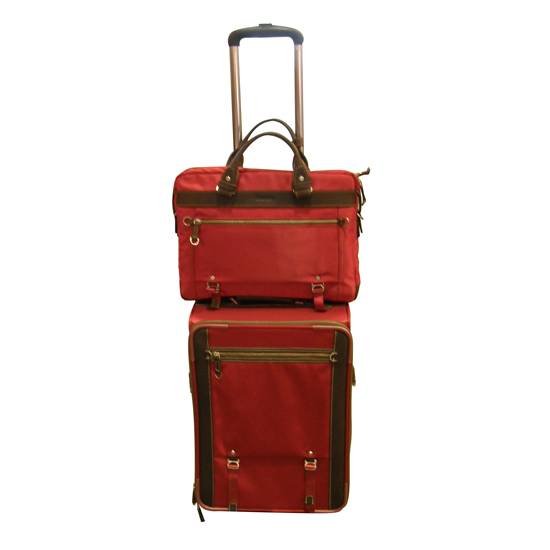 This is a luggage set which consists of a red coloured wheeled suitcase and a briefcse. The luggage set is made with PVC and ABS composite materials.